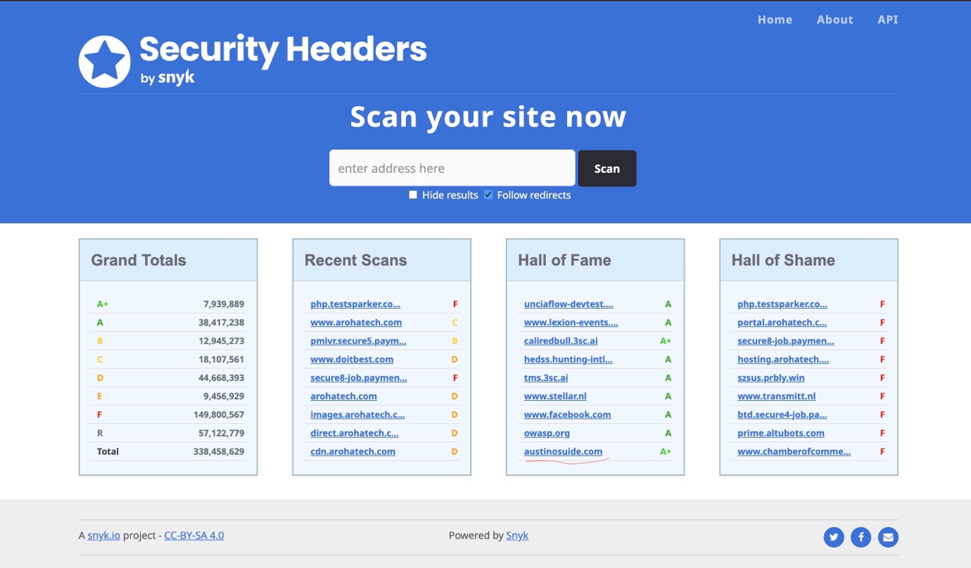 Today, my resumé site quietly joined the Security Headers Hall of Fame with a Grade A+ result. No launch party, no press release, just a small badge on a report page.